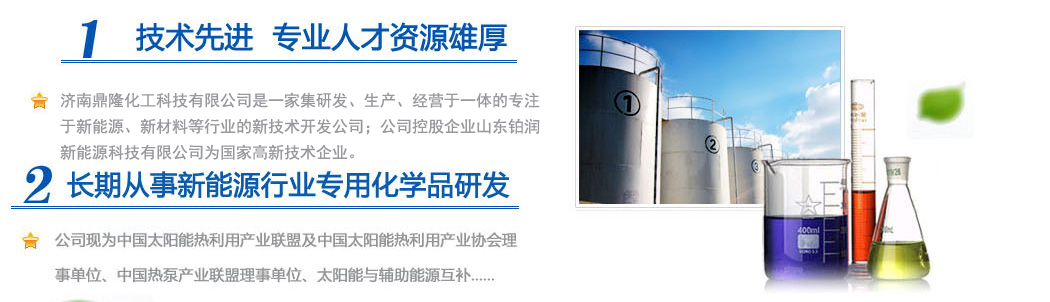 濟(jì)南鼎隆化工科技有限公司是一家集研發(fā)、生產(chǎn)、經(jīng)營于一體的專注于新能源、新材料等行業(yè)的新技術(shù)開發(fā)公司;公司控股企業(yè)山東鉑潤新能源科技有限公司為國家高新技術(shù)企業(yè)。擁有雄厚的科研實力和專業(yè)銷售隊伍以及多名從事化學(xué)化工專業(yè)的高素質(zhì)人員,其中博士生導(dǎo)師1人,碩士研究生3人。公司現(xiàn)為中國太陽能熱利用產(chǎn)業(yè)聯(lián)盟及中國太陽能熱利用產(chǎn)業(yè)協(xié)會理事單位、中國熱泵產(chǎn)業(yè)聯(lián)盟理事單位、山東清潔能源供暖產(chǎn)業(yè)聯(lián)盟理事單位、太陽能與輔助能源互補供熱/制冷工程專業(yè)委員會會員單位。公司專注于綠色科技,專業(yè)化研發(fā)環(huán)境友好型化工產(chǎn)品,與眾多高校和國內(nèi)外多家著名化學(xué)品公司保持戰(zhàn)略合作關(guān)系。公司擁有“載能”和“澤能”...更多